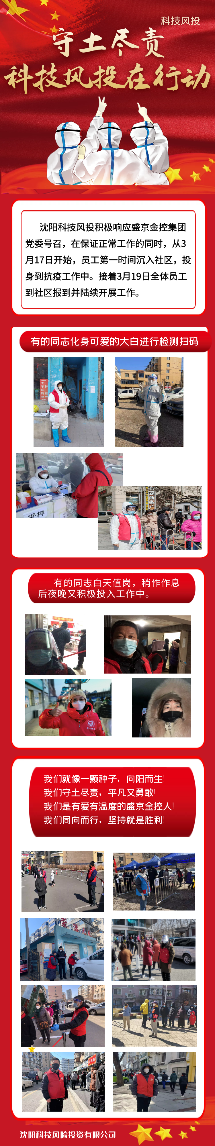 “大战”面前,科技风投的同志们不惧危险,勇敢逆行,用行动践行DB真人旗舰金控人的责任与继续,与战斗在防疫一线的同伴们一同构筑疫情防控的坚实“长城”。