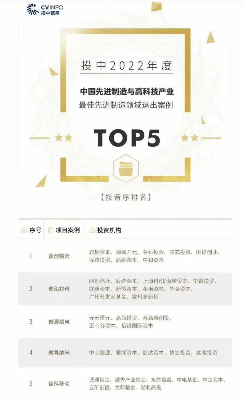 DB真人旗舰金控集团投资企业富创精密荣获投中2022年度最佳先进制造领域退出案例TOP5